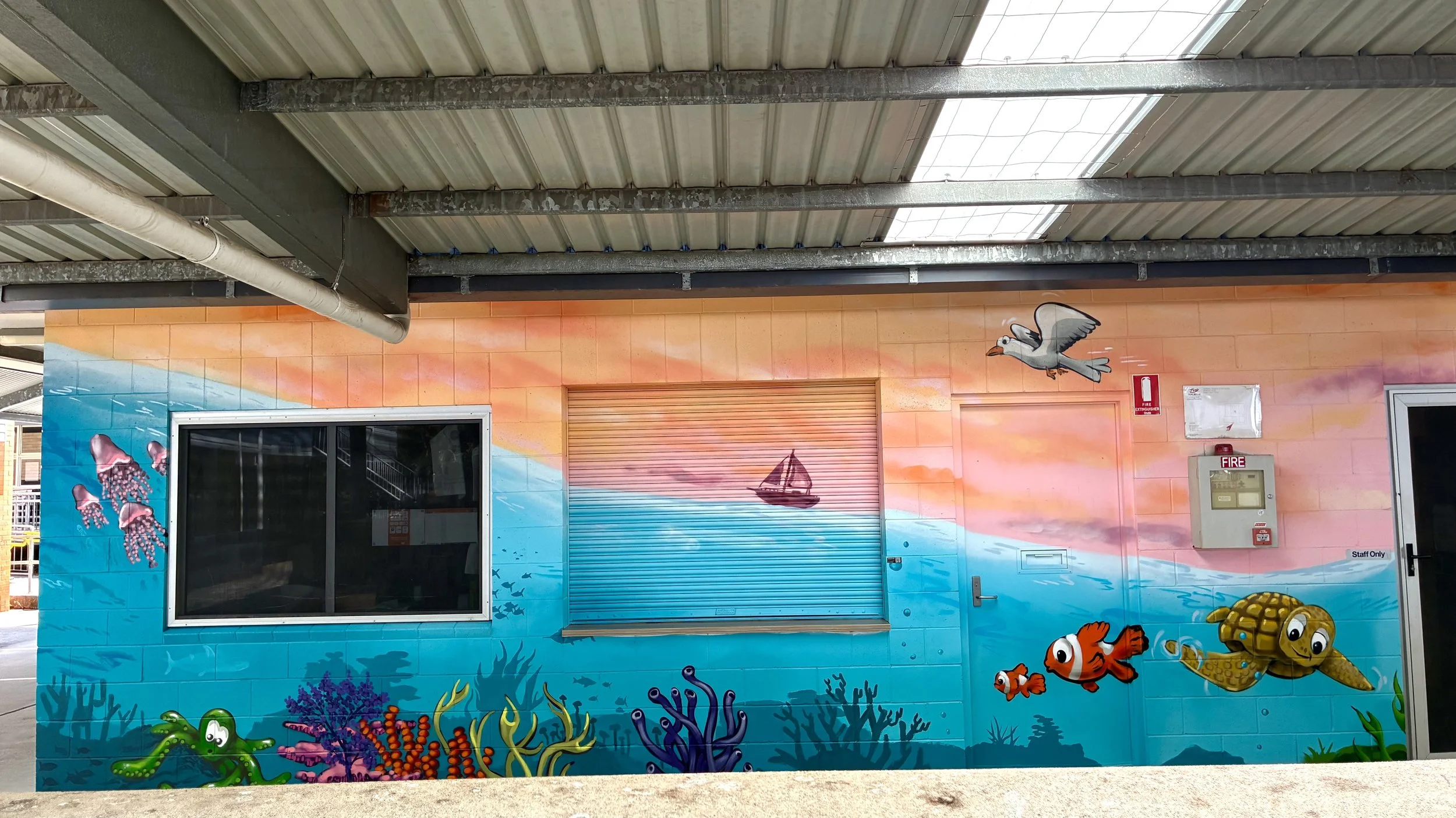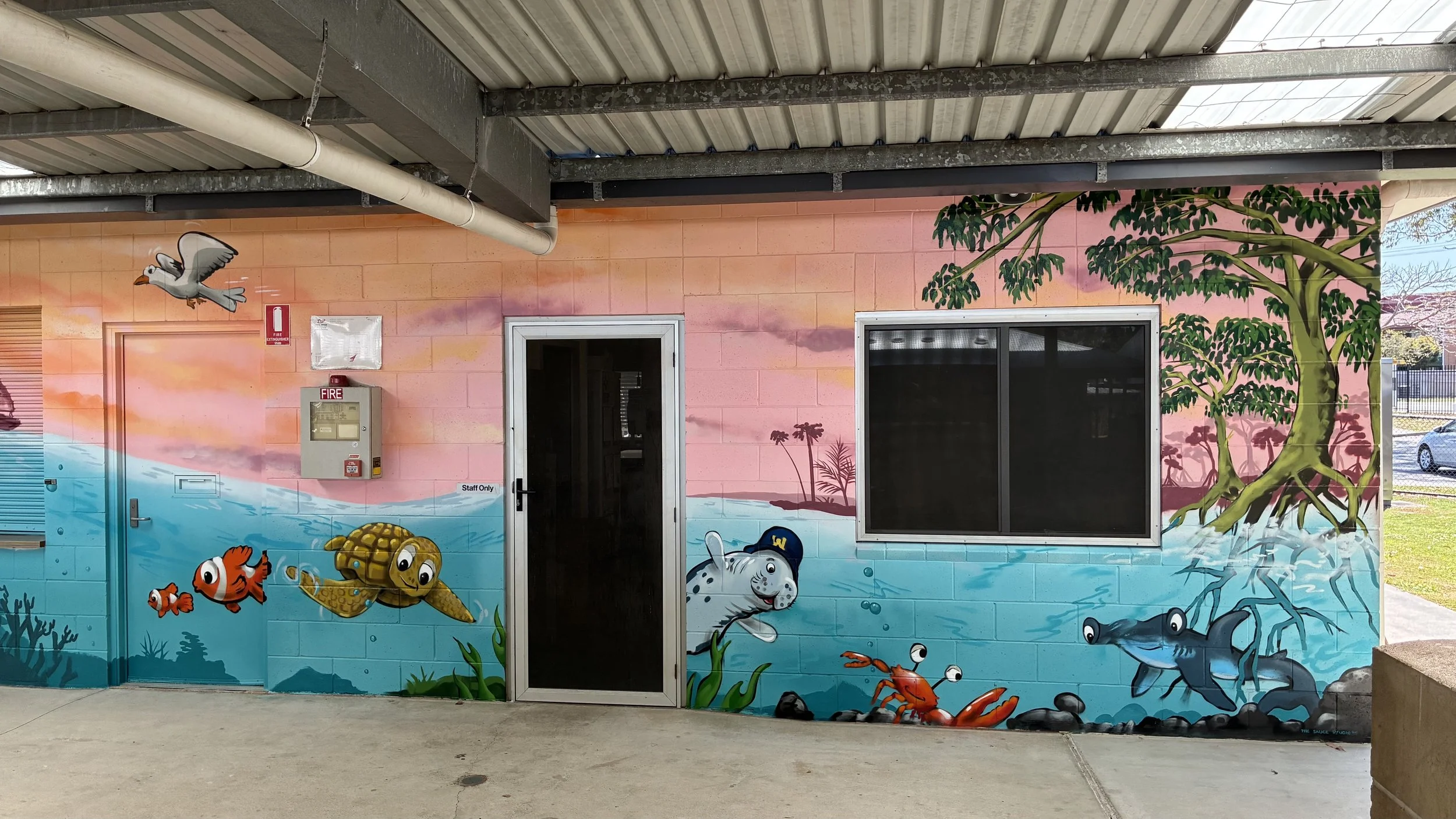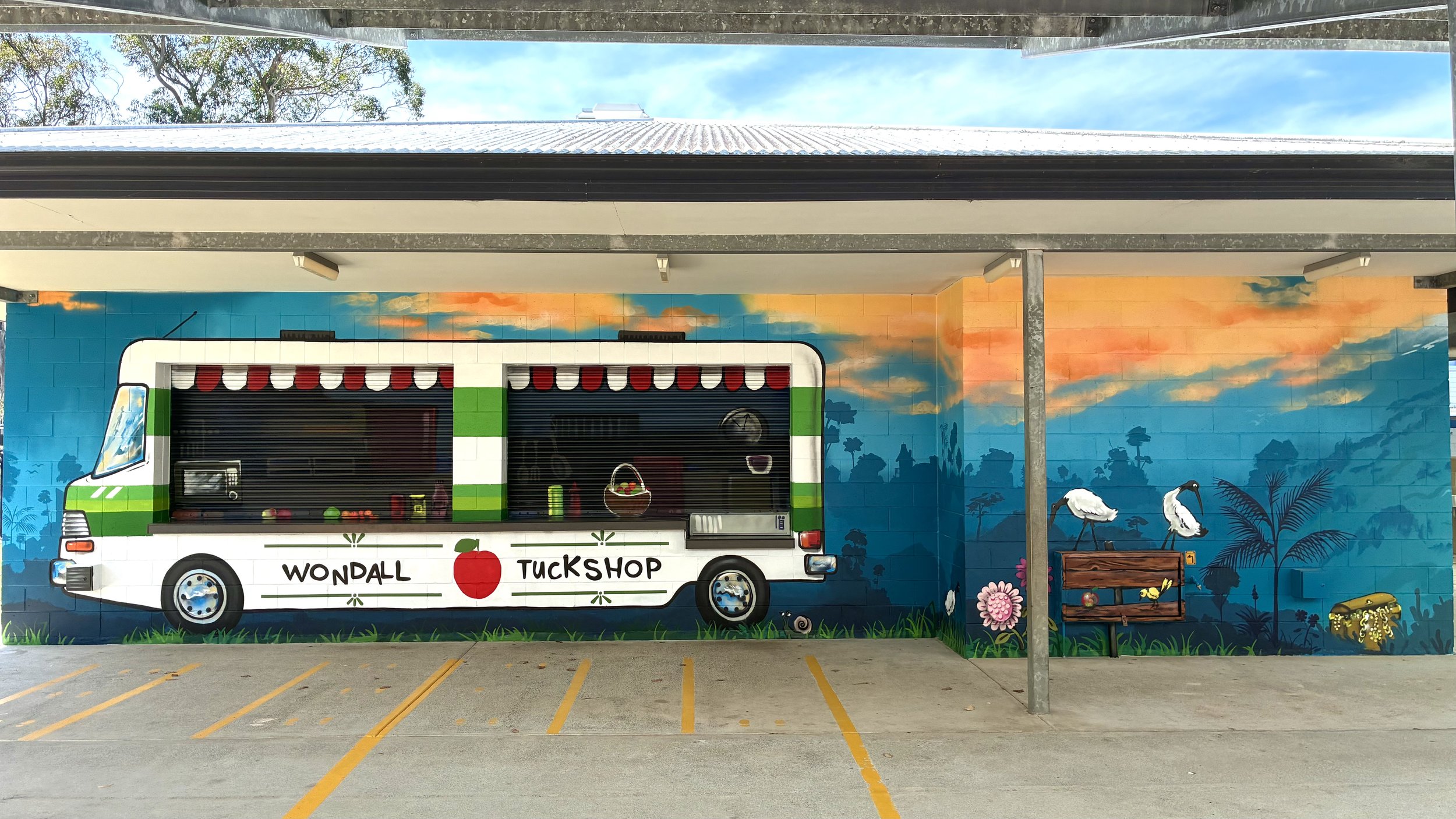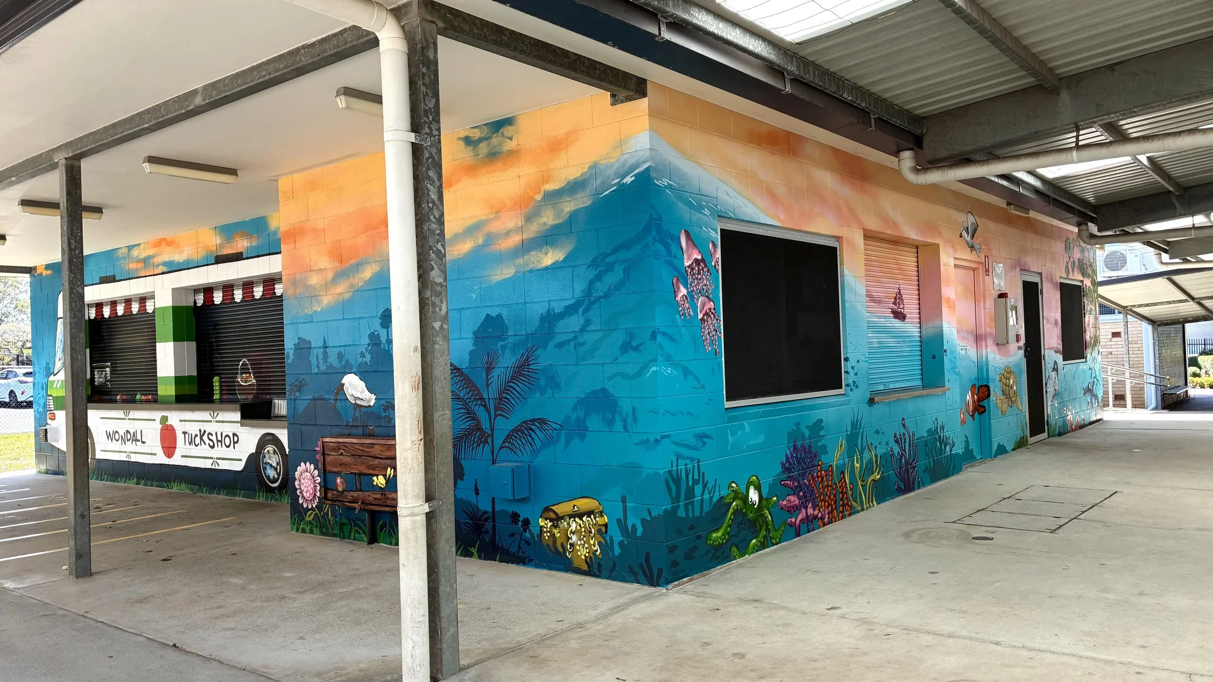 Transforming Wondall Heights State School’s tuckshop and uniform shop from dull bare brick with cool ideas from students was an enjoyable process. I channeled the enthusiasm from all of the fantastic comments throughout the painting process into the artwork.